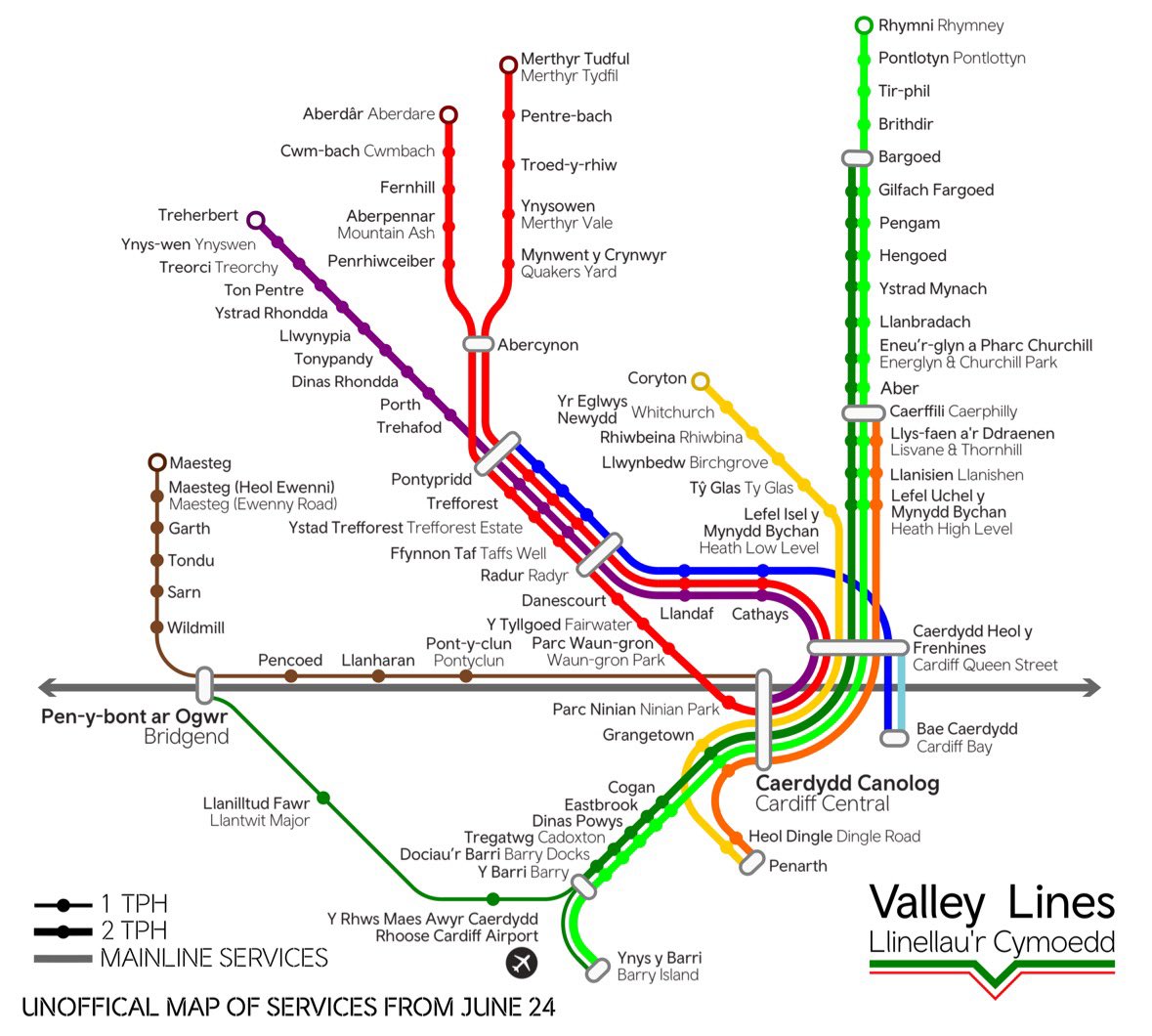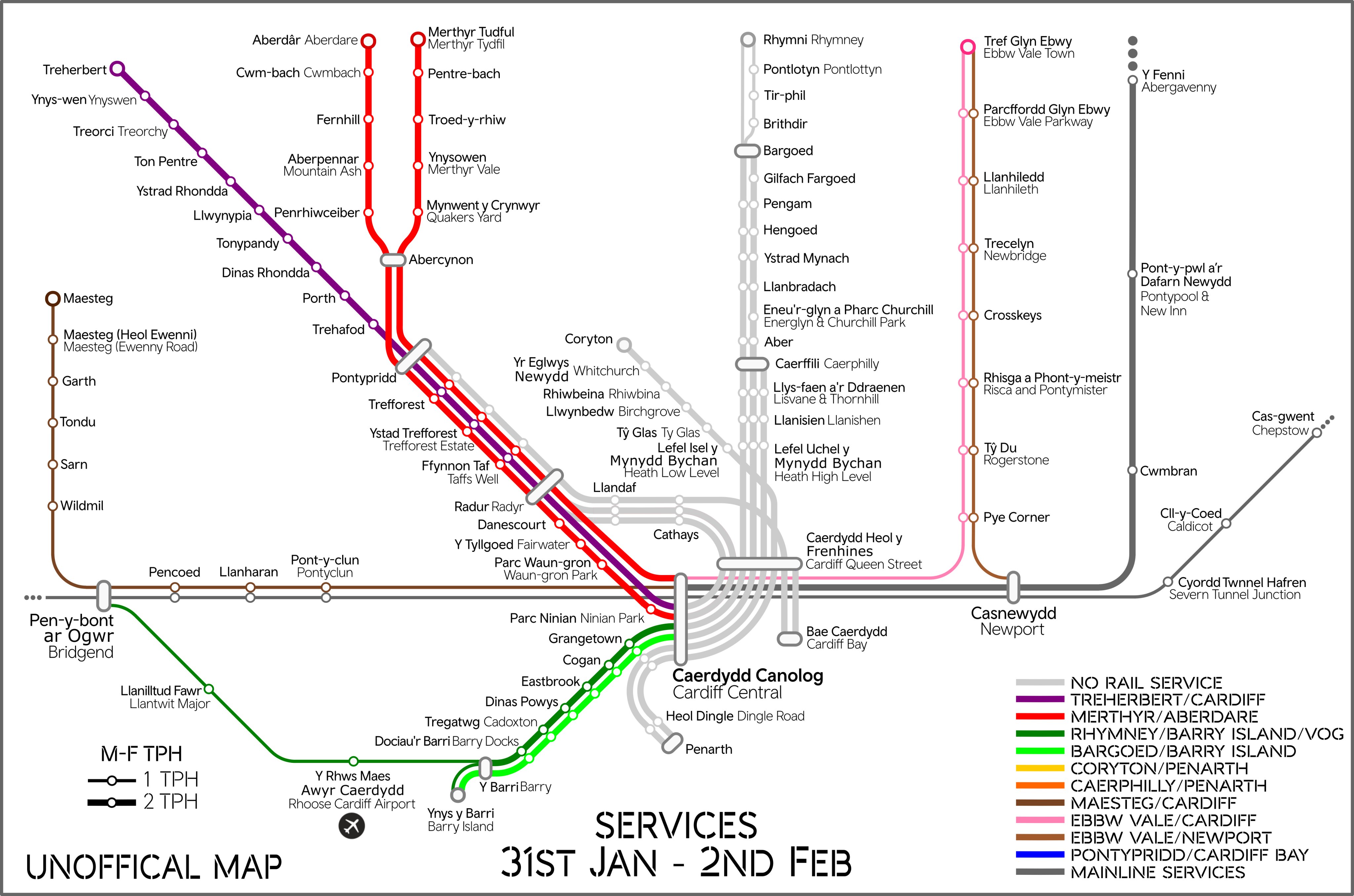 Although pre-Ebbw Vale reopening, the valley lines are all north facing. FWT have used the London tube map system of overlapping ticks for stations that serve more than one route, and whilst logical and quite pretty, is a bit 'harlequinesque' at, for example, Queen Street. As a result there is only one station symbol, possibly good, but different to most other maps which have a distinct interchange symbol. |