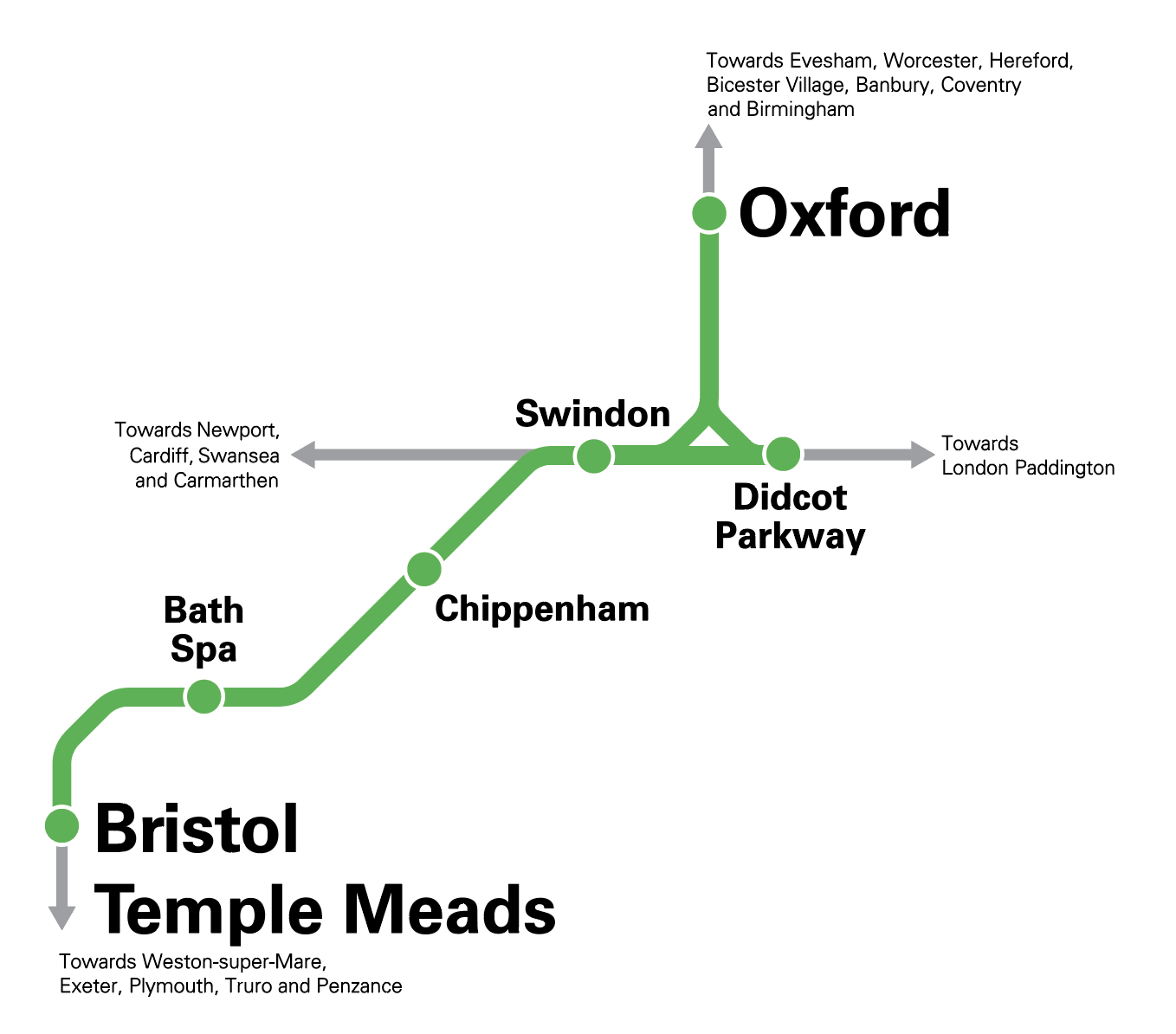 Junctions All lines correctly arrive at junctions except when they connect with 'other' routes - at Basingstoke, Southampton, Guildford, Hereford, Salisbury. Doesn't show station reversal at Gloucester.