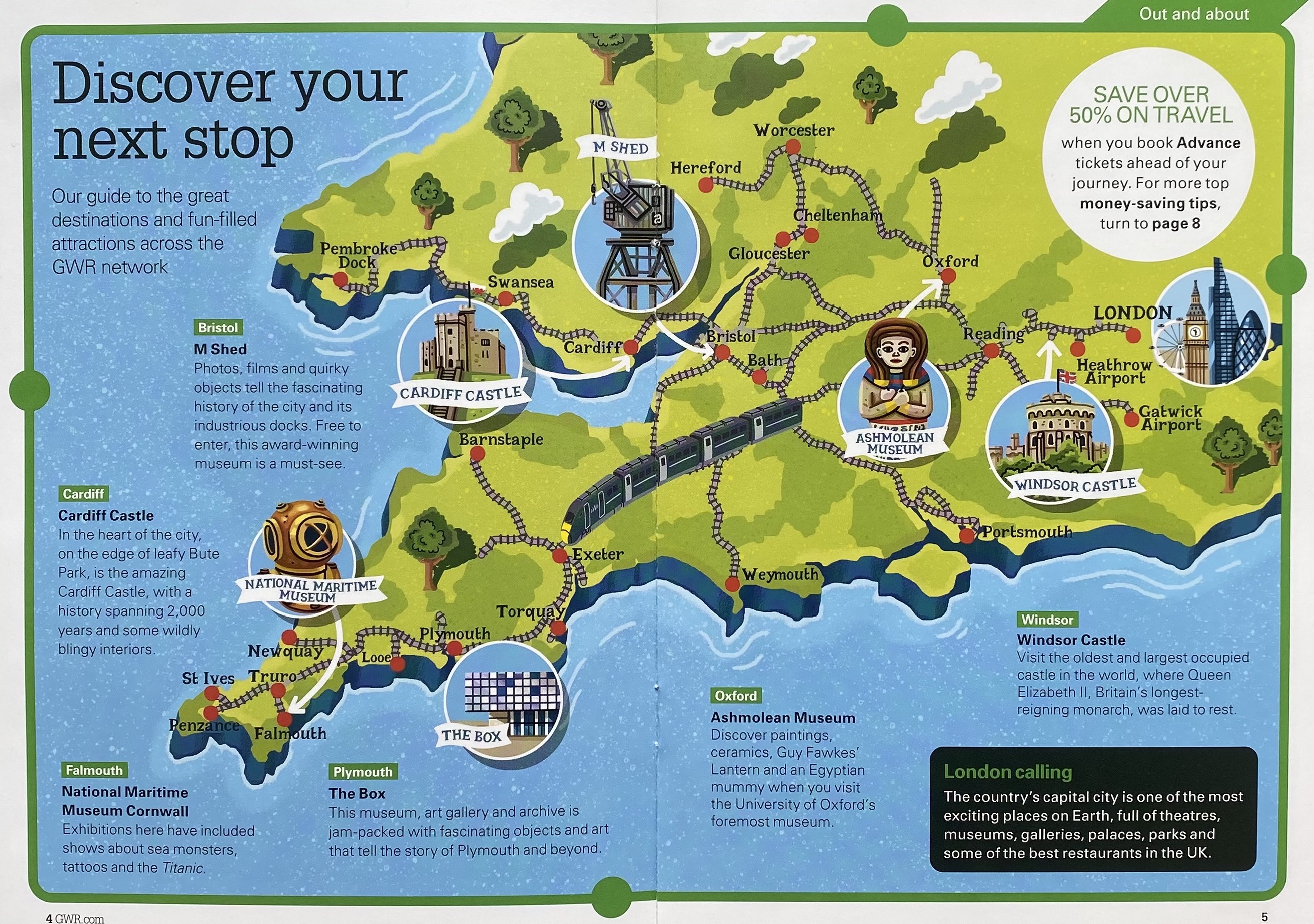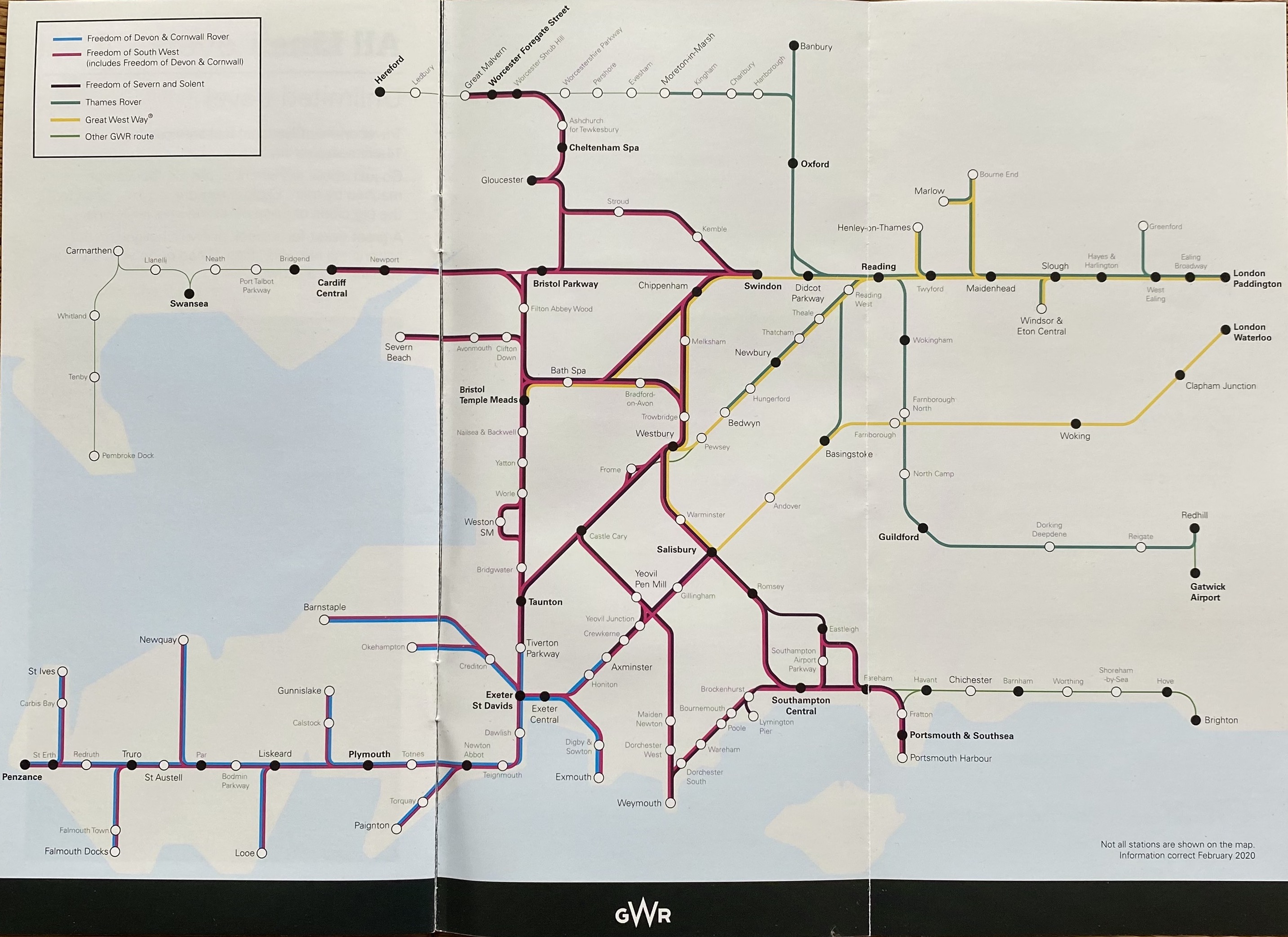 Routes Selection of routes of other operators peters out as you get close to London, so it's a bit odd showing the two Effingham Junction routes. I'm unsure why the Chiltern Trains route into London from Banbury is identified as this is a competitor. Perhaps more thought should be given to encouraging travel to and from other operators destinations, particularly to the Midlands, the north and into East Sussex and Kent. Doesn't say that not all stations are shown on other operators routes. This map shouldn't be a difficult map to design as most routes are radial from London and it doesn't really have a secondary radial conurbation (apart from Bristol), but it should attempt to show that the lines to Brighton and Worcester from Bristol are of a more local nature and part of the franchise.