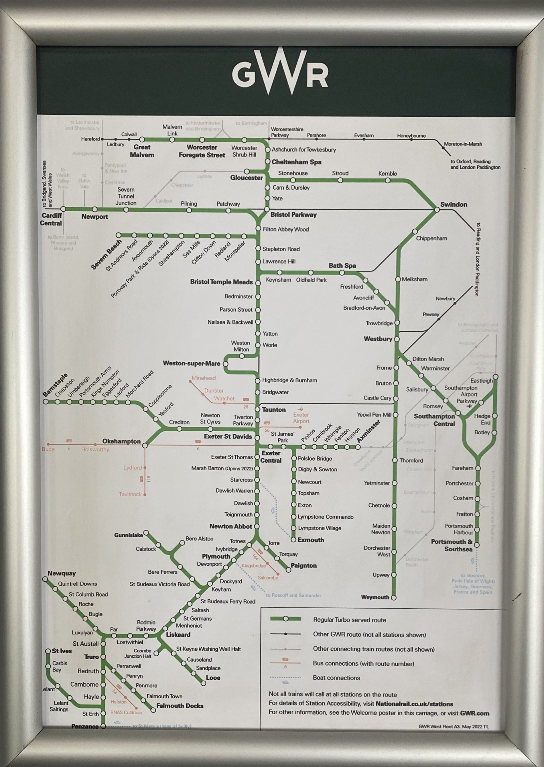 The later, virtually useless, as the map is unrecognisable as the west and south-west corner of the United Kingdom, particularly as there is no coastline. Is the distortion too much to bear? OK, so it has got every station on it and every connecting bus service, so is a useful reference tool. But does it help you understand how the network works or help you plan a journey?