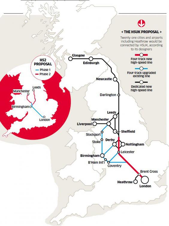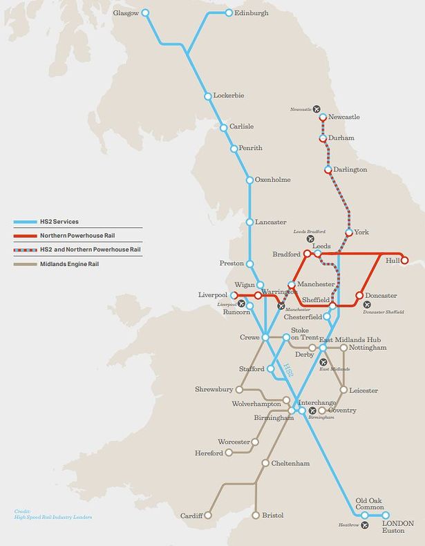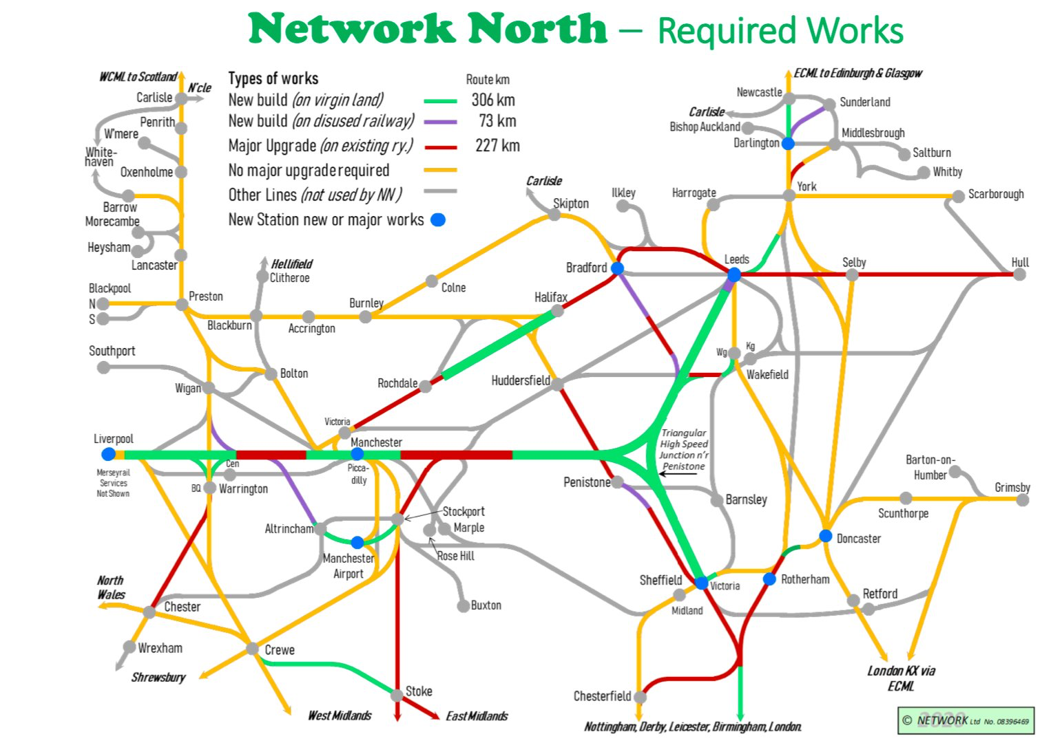 Suggests ditching HS2 Phase 2, building new high-speed trans-Pennine line (Woodhead), a parallel ro-ro lorry service, E-W tunnel under Manchester, viaduct across Bradford city centre, hub at Sheffield Victoria.