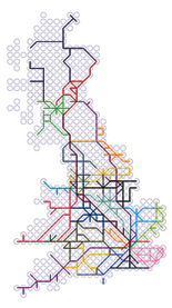 This is a very interesting map. To get all these routes to fit onto that coarse grid of circles is quite clever. Luckily, having only to show groups of routes there is no problem with multiple colours. For the first time, a national rail map has the Goring gap (where north-south and east-west services share the same line) shown correctly at 45ยบ.
