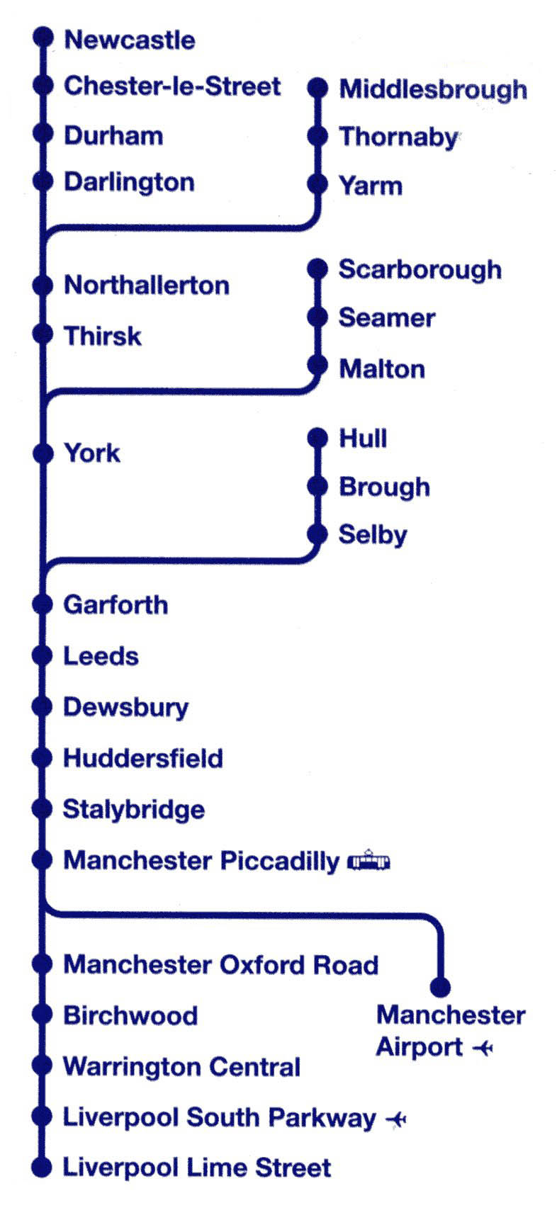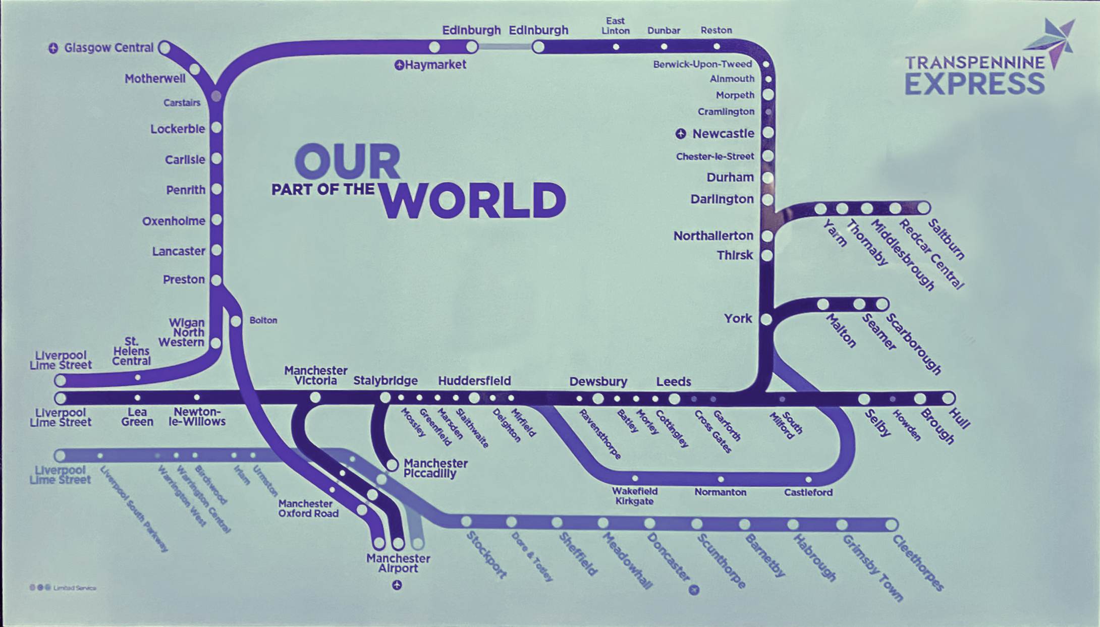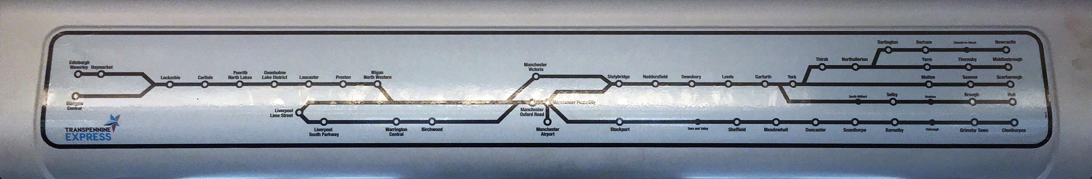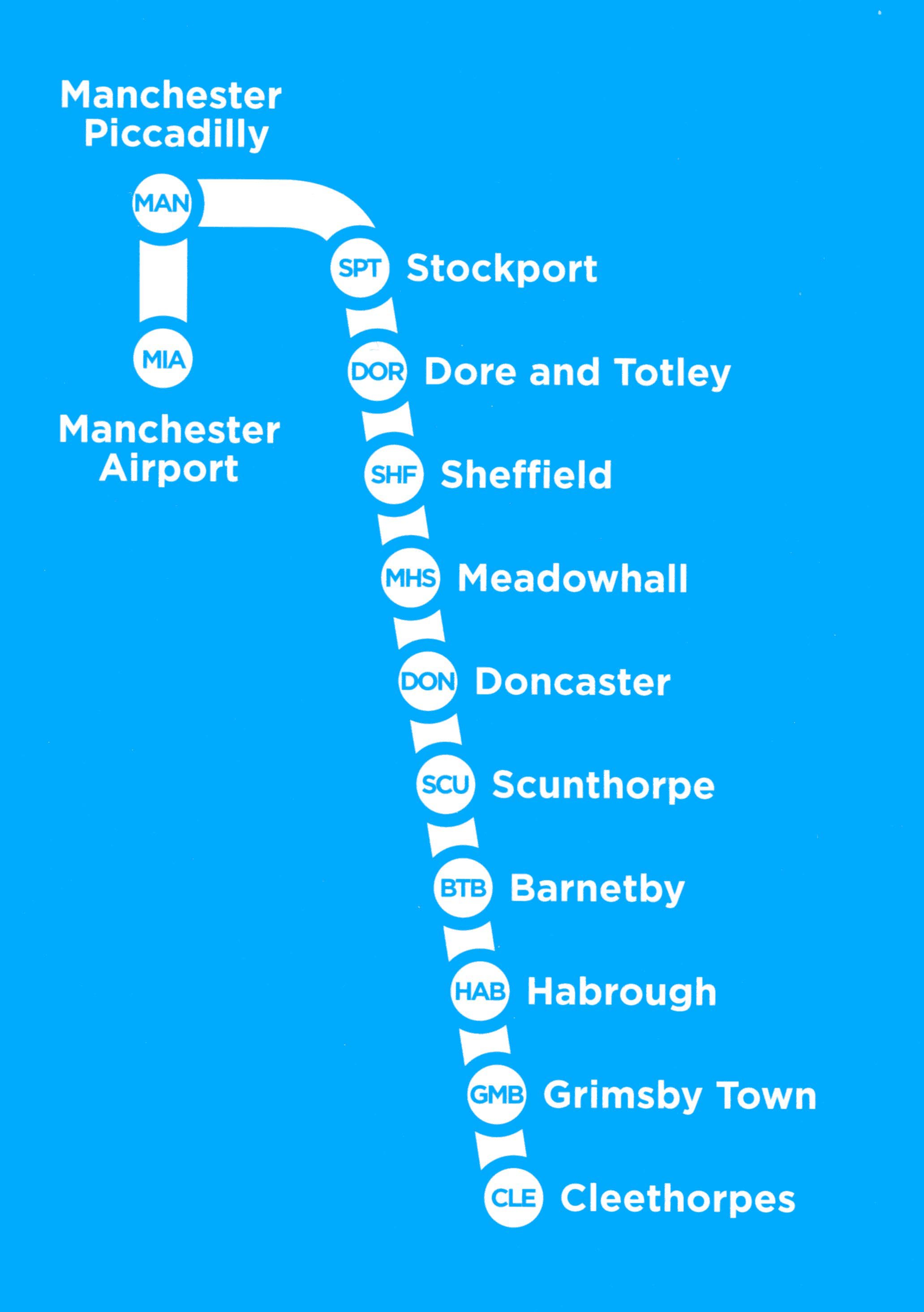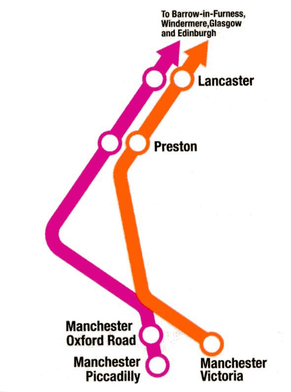 • Multiple station name font sizes that don't seem to relate to the stations importance (ie Wigan is smaller than Birchwood which is smaller than Seamer);